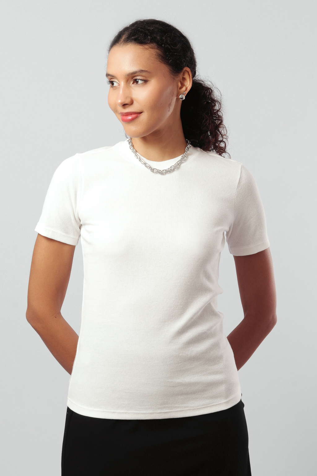 Com o shape slim (justinho, mas confortável, rente ao corpo), gola U bem redondinha, contornando o pescoço e manga curta, você tem a peça perfeita para usar como base para as suas composições.
